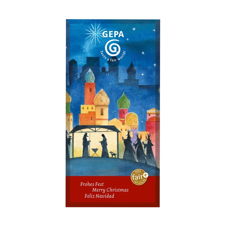 Das klassische Krippenmotiv des Schoko-Adventskalenders hat dieses Jahr die britische Künstlerin Helen Brindley entworfen. Der Stern von Bethlehem leuchtet am klaren Nachthimmel und besticht durch seine symmetrischen Formen. Er lässt auch die Häuser im warmen Licht erstrahlen. Im Mittelpunkt steht die erleuchtete Krippe mit dem Jesuskind. Im selben Design ist auch eine Weihnachtsschokolade im 100- und 40-Gramm-Format erhältlich.
