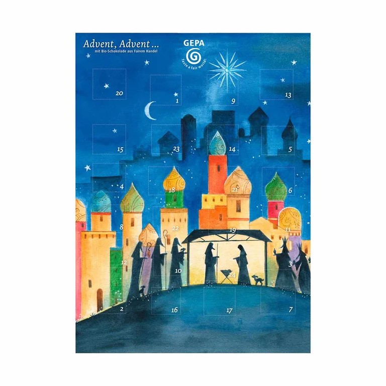 Hinter den 24 Türchen verbirgt sich rundum faire Bio-Schokolade und jeden Tag ein Teil der Weihnachtsgeschichte – weil ihr euch das gewünscht habt! Der Text steht aus Qualitätsgründen unter dem Blister mit den Schokolädchen, nicht mehr auf der Innenseite der Türchen.