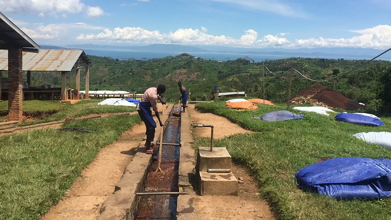 Die Kaffeebäuer*innen von KOPAKAMA leben in Streusiedlungen am Ufer des großen Kivu-Sees. Ihren erstklassigen Kaffee (Arabica Bourbon) bauen sie in kleinen Kaffeegärten an. Dort wachsen zum Beispiel noch Maniok, Süßkartoffeln, Bohnen, Bananen und Mais. Seit die Bäuerinnen selbst Mitglied von KOPAKAMA sind, können sie u.a. selbst über die Einnahmen verfügen und haben auch zu Hause ein größeres Mitspracherecht. Für die Kaffeebäuerinnen, die beim Frauenprojekt „Ejo Heza“ („Für eine bessere Zukunft“) mitmachen, hat KOPAKAMA Gemeinschaftsland erworben.