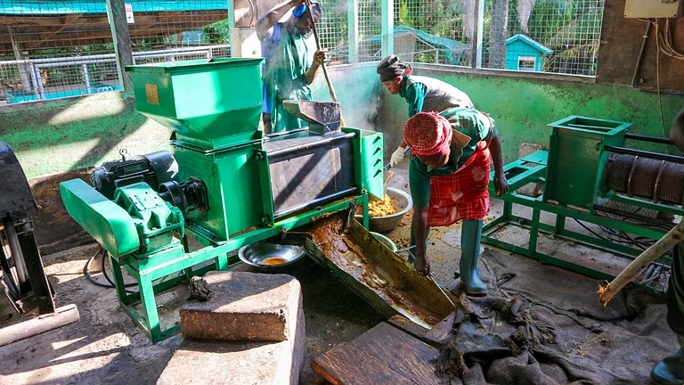 Serendipalm zeigt, dass Palmöl fair und ökologisch hergestellt werden kann. Die dazu benötigten Bio-Ölfrüchte werden von Bäuer*innen geerntet, die sich in Gruppen zusammengeschlossen haben. Die Bäuer*innen erhalten für ihre Bio-Ölfrüchte von Serendipalm einen höheren Preis. In der Ölmühle von Asuom werden sie dann zu Bio-Palmöl verarbeitet. Die dort arbeitenden rund 400 Mitarbeiter*innen erhalten im Vergleich zur Region zwischen 25 und 30 Prozent höhere Löhne, sind kranken- und sozialversichert, erhalten Urlaub und werden auch im Fall von Krankheit bezahlt. Geregelte Arbeitszeiten, Bonuszahlungen und eine regelmäßige und verlässliche Auszahlung des Lohns sind in Ghana ebenfalls nicht selbstverständlich. Die Löhne werden jedes Jahr erhöht.