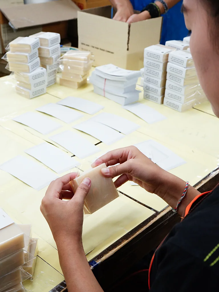 Zum Team von SOAP-n-SCENT gehören die Frauen und Männer in der Seifenproduktion, aber auch Mitarbeiter*innen für Design, Qualitätskontrolle, Marketing und Einkauf. Letztere halten den Kontakt zu den Rohwaren-Lieferanten, u.a. den Ölmühlen für Kokos- und Reiskleie-Öl. SOAP-n-SCENT fühlt sich ebenfalls verantwortlich für die Produzentengruppen, die die Verpackungen für die Seife herstellen. Auch sie werden einmal im Jahr zu SOAP-n-SCENT eingeladen. Auf eine langfristige Zusammenarbeit mit den Mitarbeiter*innen sowie den Firmen und Händlern wird Wert gelegt.